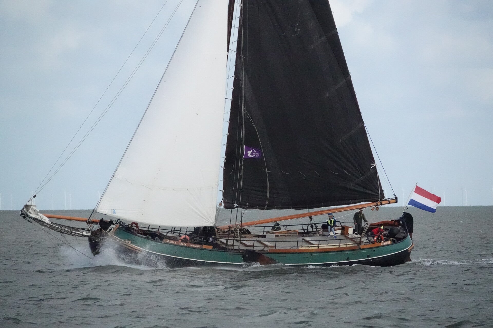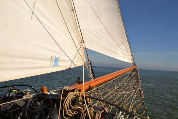 Dan tussen de strekdammen door het grote water op. Zeilen hijsen onder toeziend oog van schipper en maat, schoten worden belegd met een 8-knoop, het zwaard zakt aan lij, motor uit… stilte. Het zeilen is een natuurkundig wonder wat je de komende week gaat doorgronden.